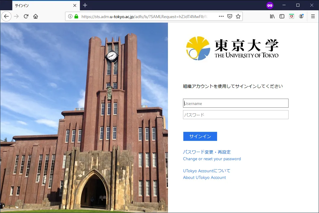 東京大学の学生であることを証明するため、いつもの UTokyo Account でログインします。